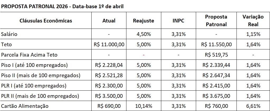 Durante o encontro, a bancada dos trabalhadores conquistou uma proposta patronal que apresenta avanços importantes para a categoria. Entre os pontos principais, estão o reajuste com aumento real nos salários, na PLR e no cartão-alimentação, garantindo a recomposição do poder de compra.